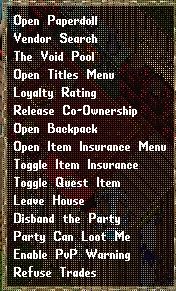 - 파티원 전리품 획득 금지 - 이 옵션은 트라멜 규칙 하에선 파티원 시체에서 전리품을 챙길 수 없게 합니다. 다만 무법지대인 펠루카에선 이 옵션이 설정돼도 전리품을 챙길 수 있지만, 대신 챙길 경우 파티원은 범죄자가 되며 카르마를 잃게 됩니다.